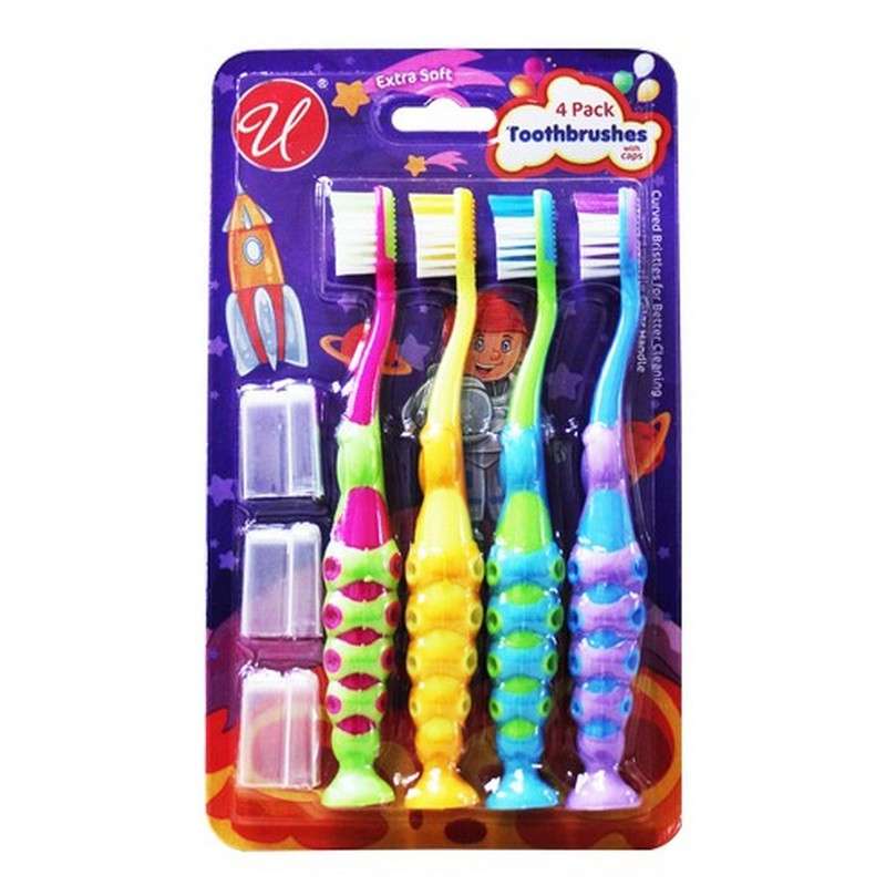 Kids' Toothbrushes with 3 Caps - 4 Pack, Assorted Colors