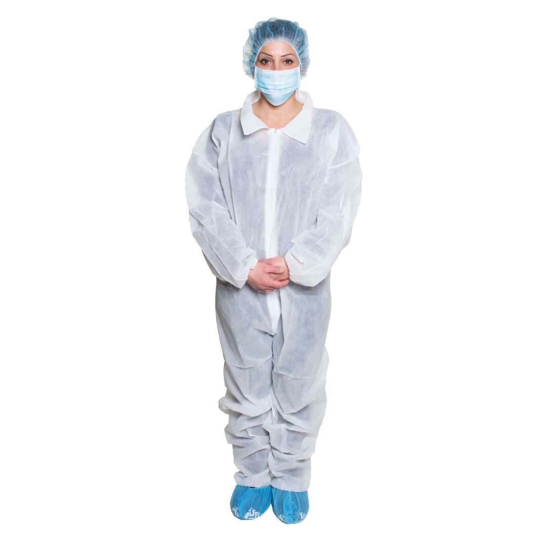 The coveralls are made of durable spunbonded polypropylene. They also have a front zip closure with an elastic wrist and ankle cuffs. There are 25 coveralls per case.