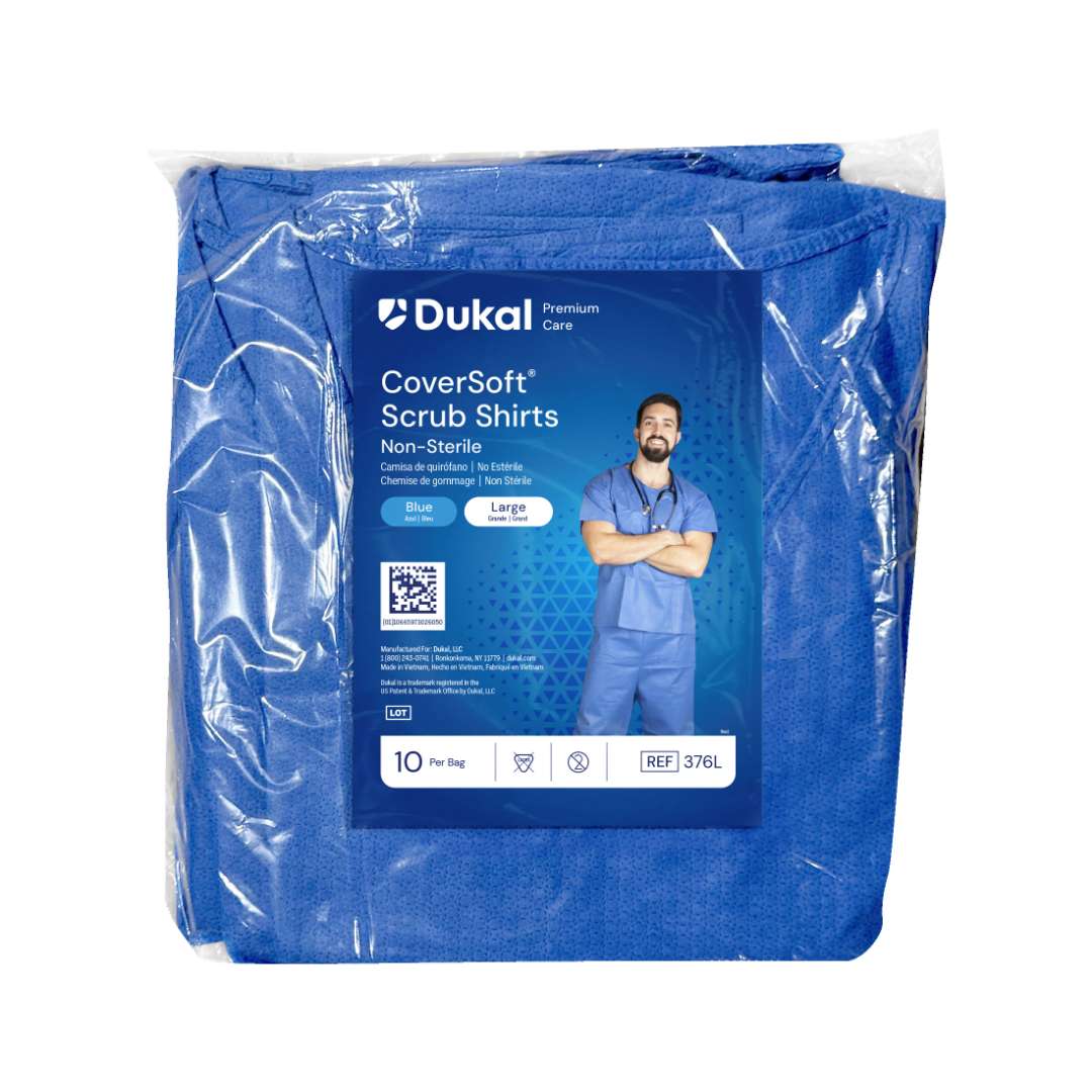 The blue scrub shirts have extra soft material that feels like real fabric. The Coversoft material is made of polypropylene, which provides water resistance while remaining breathable. The shirts have two pockets, one on the top left and one on the bottom right. There are 50 scrub shirts per case.