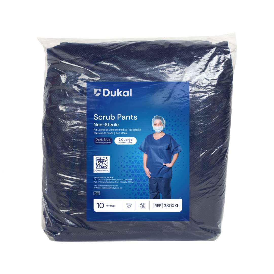 The dark blue scrub pants are made of durable spunbonded polypropylene. They also have a drawstring tie waist, one front pocket, and one back pocket. There are 50 scrub pants per case.