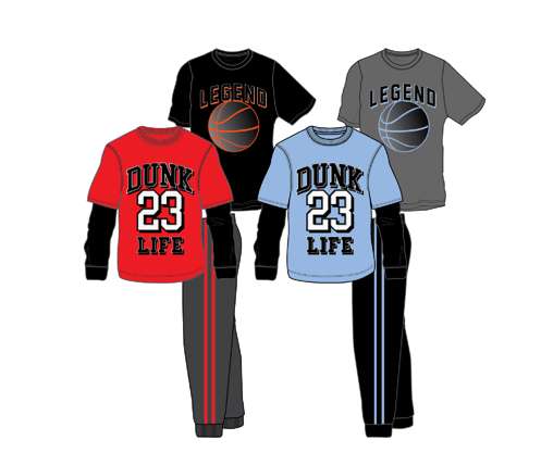 Tricot Pant sets include a t-shirt, dual-sleeve shirt, and pant ideal for keeping little boy's warmer in the cooler months. Coming in two different colored sets, both red and blue with 'Dunk Life' and 'Legend' print, these sets are a great addition to any little boys' closet. Perfect for adding to clothing drives.