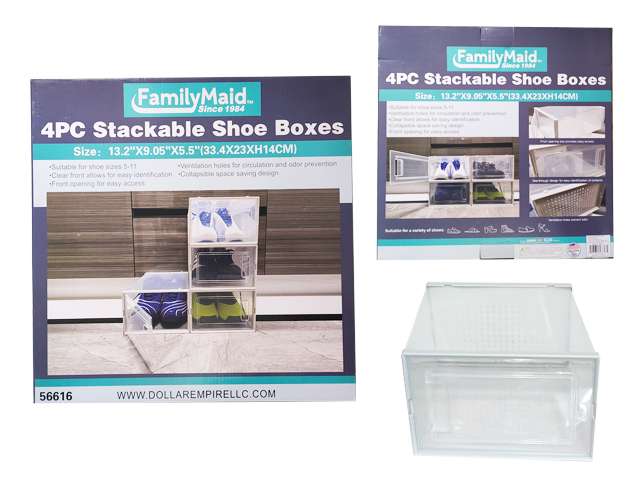 - Stackable plastic boxes for versatile shoe storage