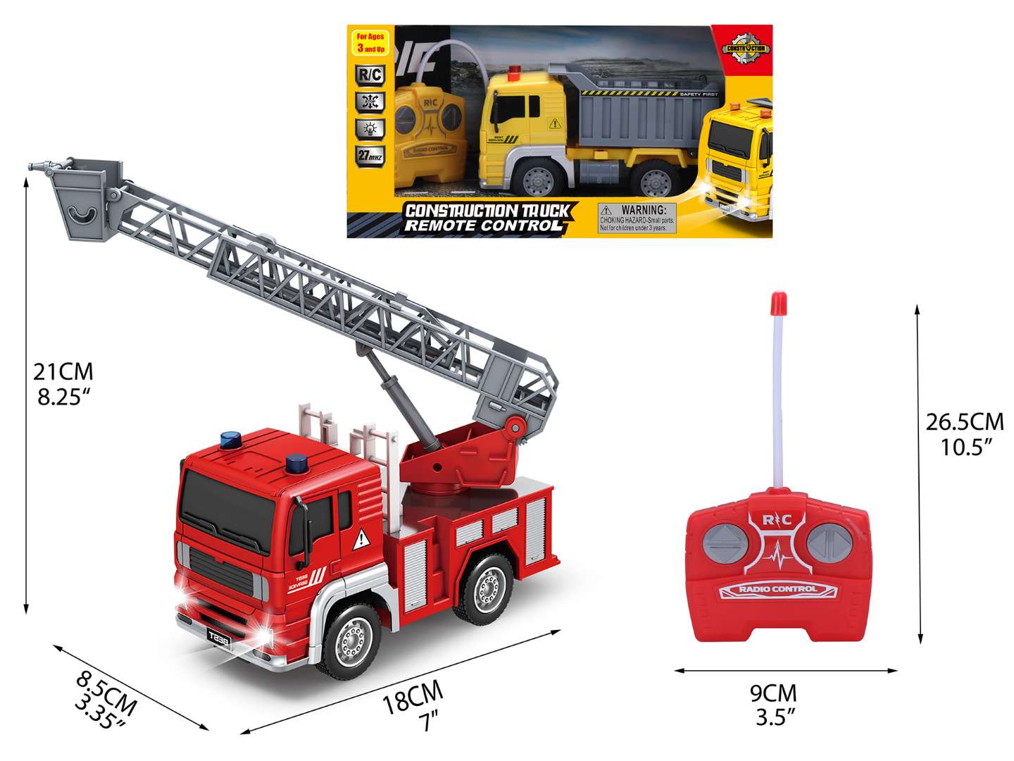- Assorted fire truck with an extendable ladder and a construction dump truck