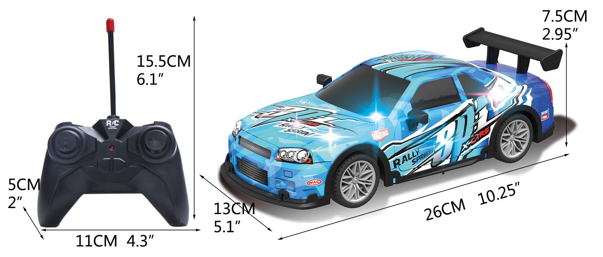 Boys and girls will love maneuvering these 10.25" remote control rally cars everywhere. With lights and a sporty eye-catching graphic design kids will have exciting adventures for hours.