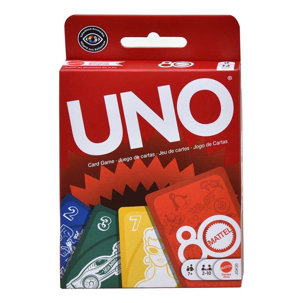 Celebrate 80 years of fun with the UNO card game, which includes graphics to classic toys. Players take turns matching a card in their hand to the top card of the discard pile, either by color, number, or symbol. The first player to get rid of all their cards wins!