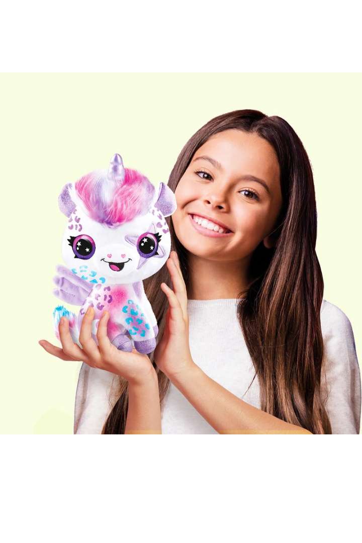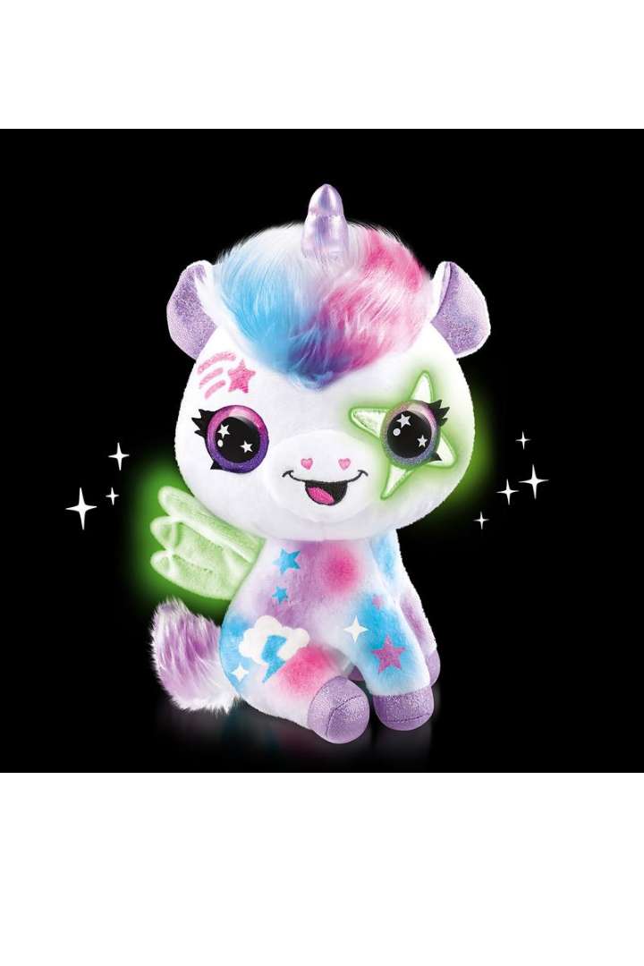 Meet the new Airbrush Plush Glow in the Dark Unicorn! Create dazzling, glowing designs on your favorite plush with the easy-to-use airbrush sprayer and stencils. Kids can customize, wash, and redesign endlessly for magical fun that shines even in the dark!