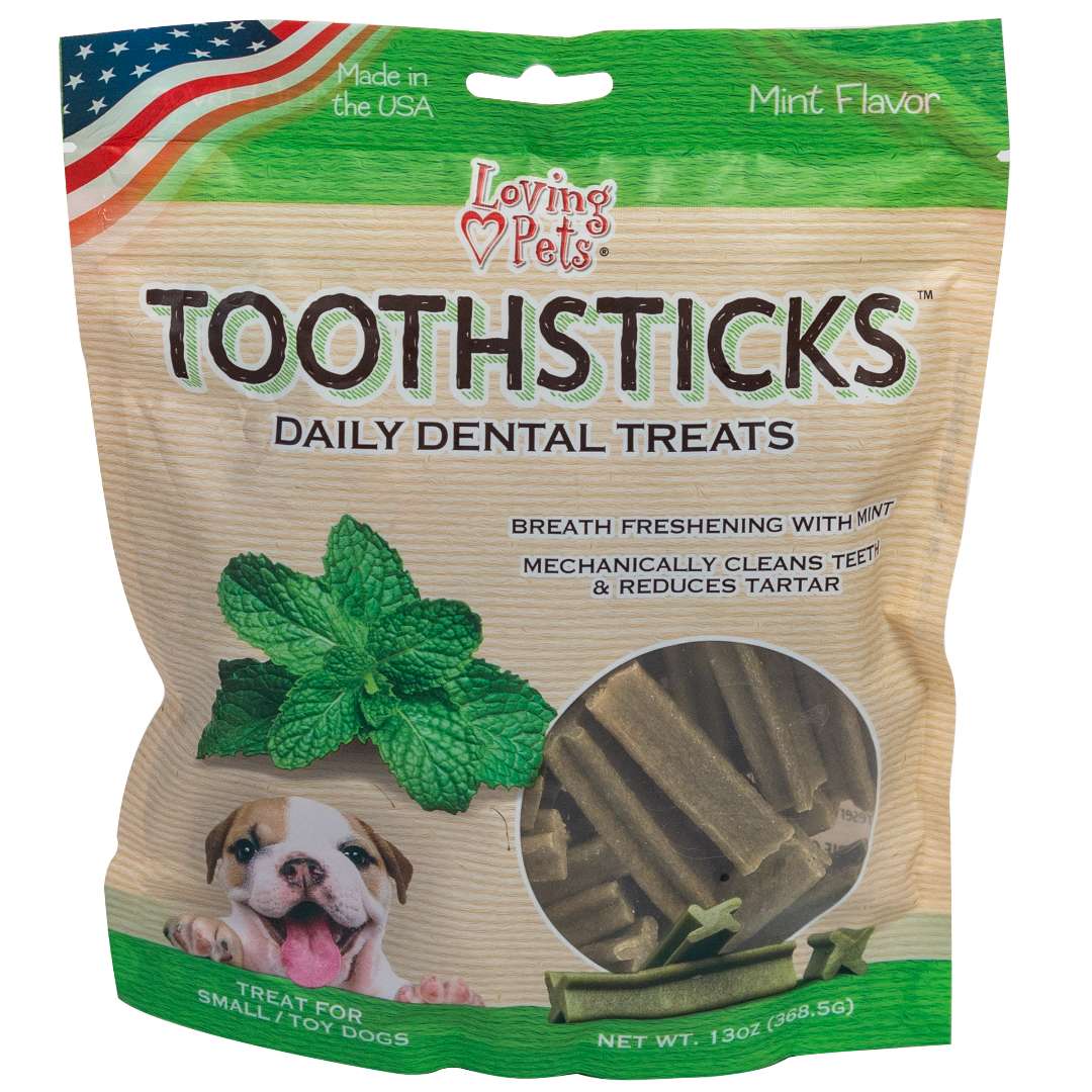 Mint Flavored Dental Treat Sticks come in a convenient 13-ounce bag, offering small dog owners an effective and enjoyable daily treat for fighting plaque and freshening breath. Perfect for promoting oral health while satisfying your pet's taste buds.