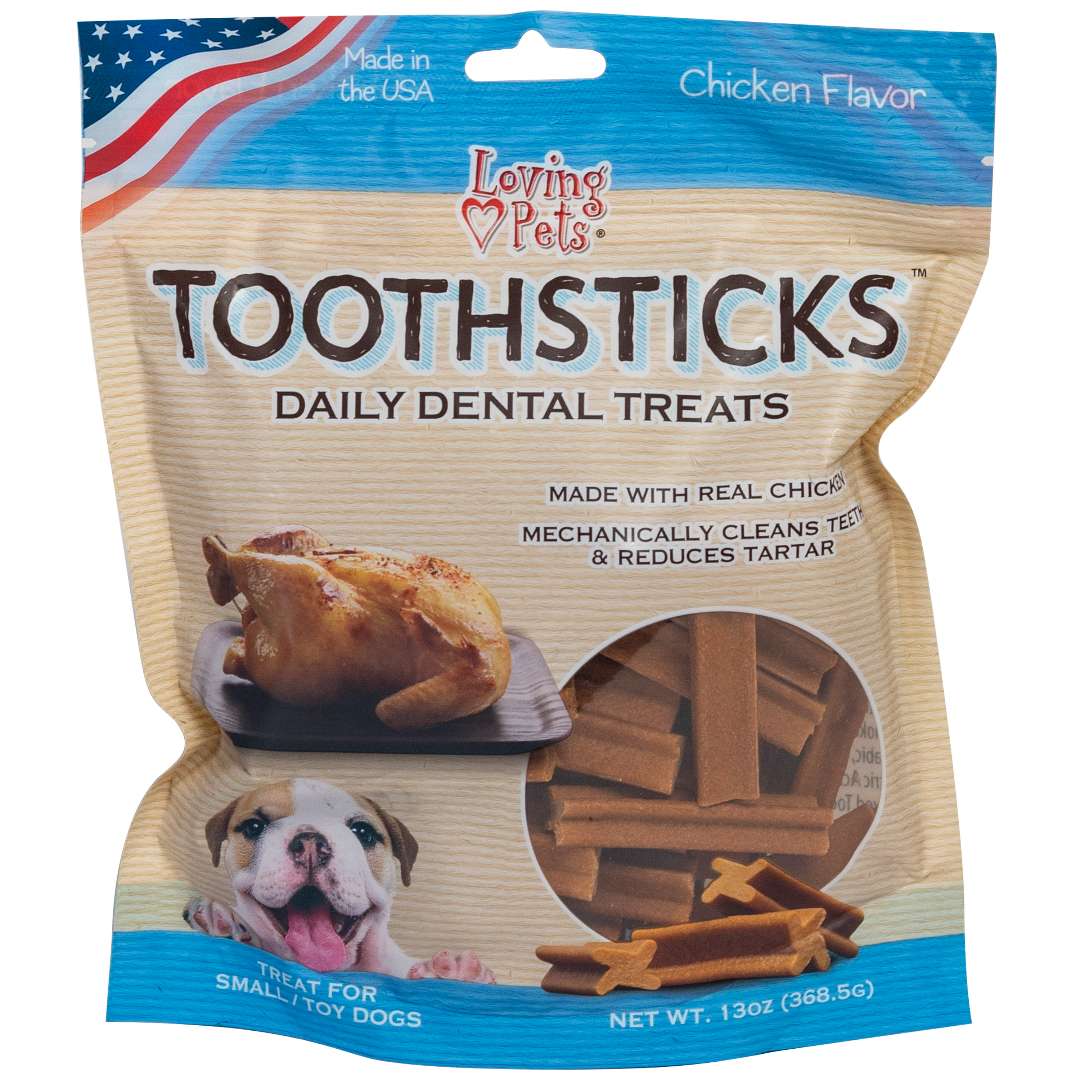 Chicken Flavored Dental Treat Sticks come in a 13-ounce bag, perfectly sized for small breeds. Each stick features a unique pinwheel shape that helps scrub away plaque and tartar while massaging gums. Turn chew time into cleaning time with these tasty treats!