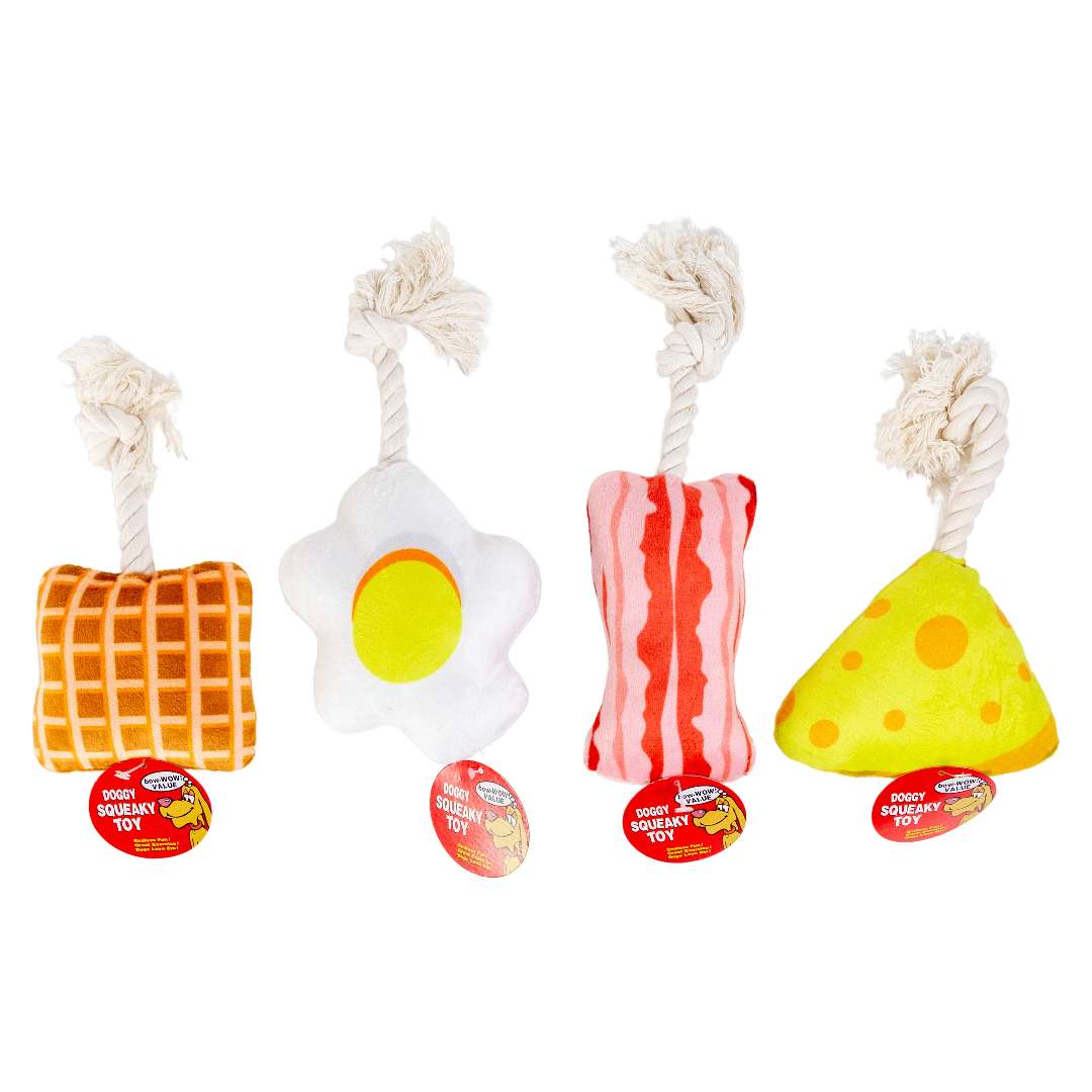 Dog Plush Toy with Rope combines the softness of plush material with a durable rope for endless playtime fun. This assortment includes four food-themed designs, making it a playful and appealing choice for pet owners. Presented in a convenient counter display, it's an excellent impulse buy near checkout areas.