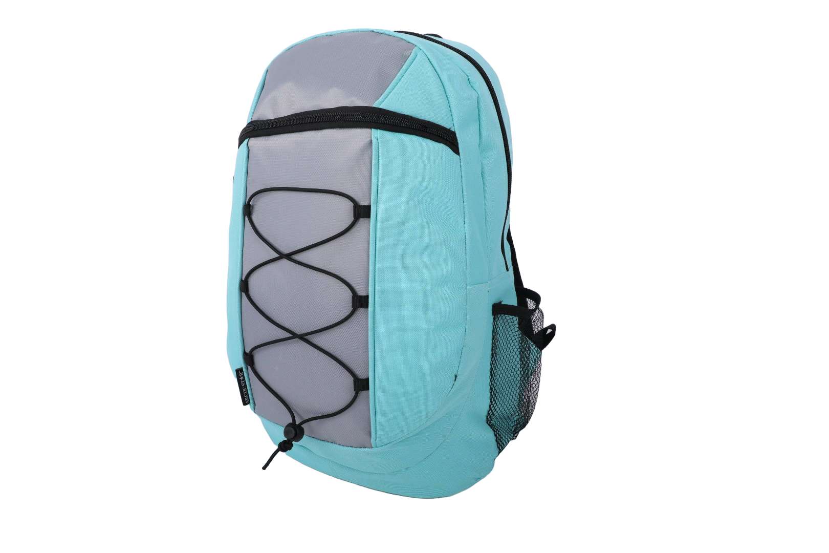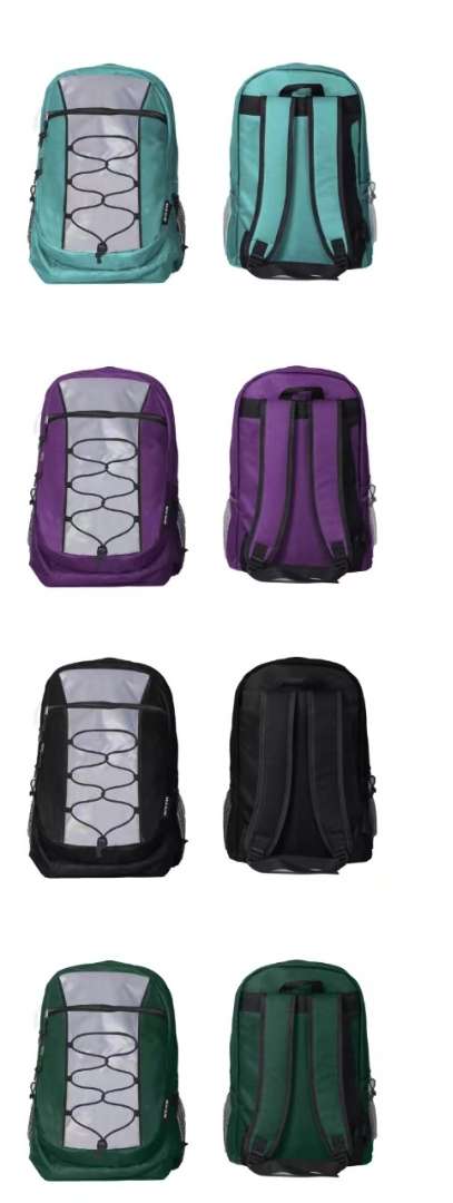 This backpack measures 17" and has a bungee corded front with 2 side mesh pockets. The backpack also has a large main compartment with 1 large front zipper compartment with a reflective front panel. The back and straps also have padding for a softer fit. There are 24 assorted colors per case.
