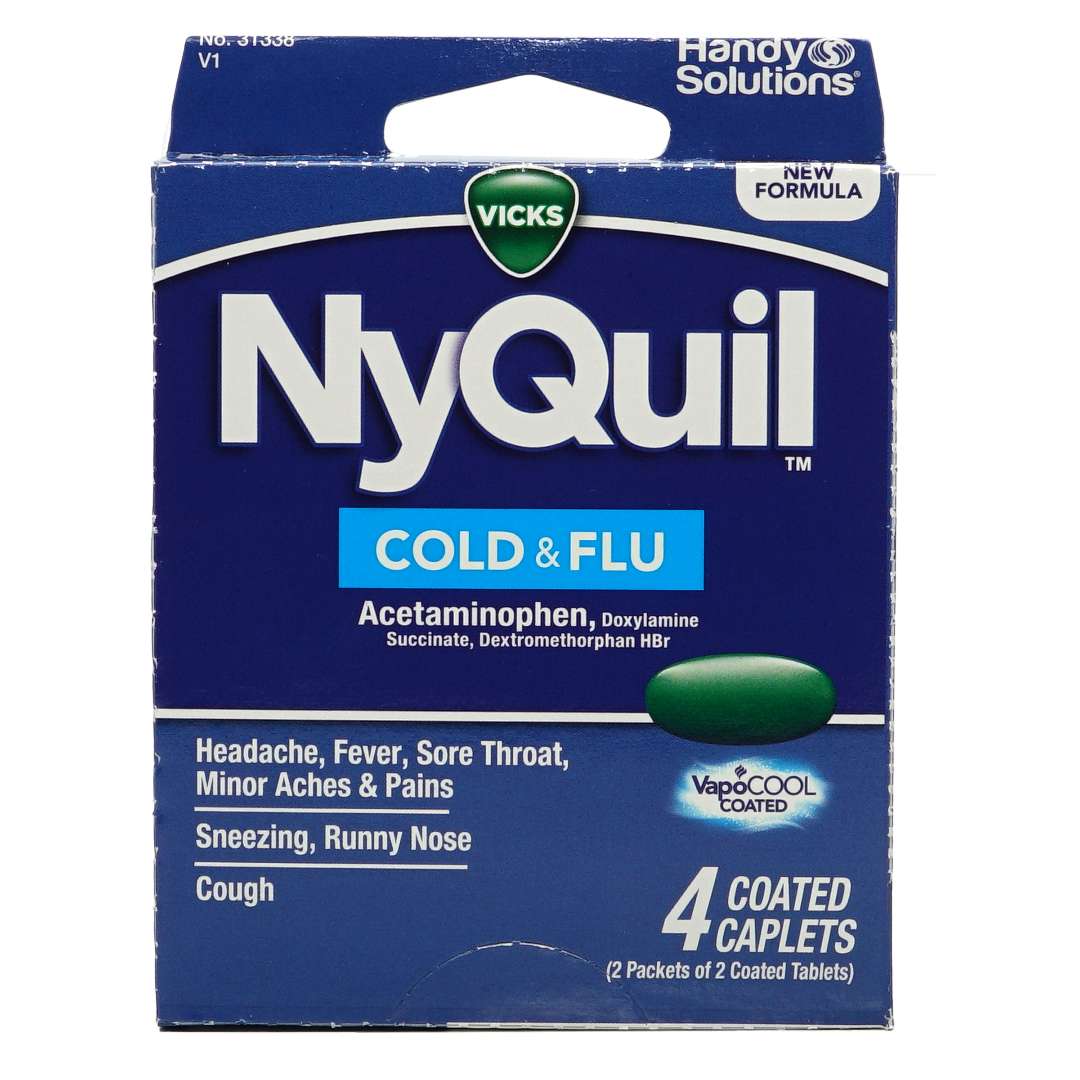 NyQuil Vapocool caplets for cold and flu helps with headaches, fevers, sore throat, minor aches, runny nose, and sneezing. This is a great grab-and-go at checkouts or for those traveling. There are 144 four-packs per case.