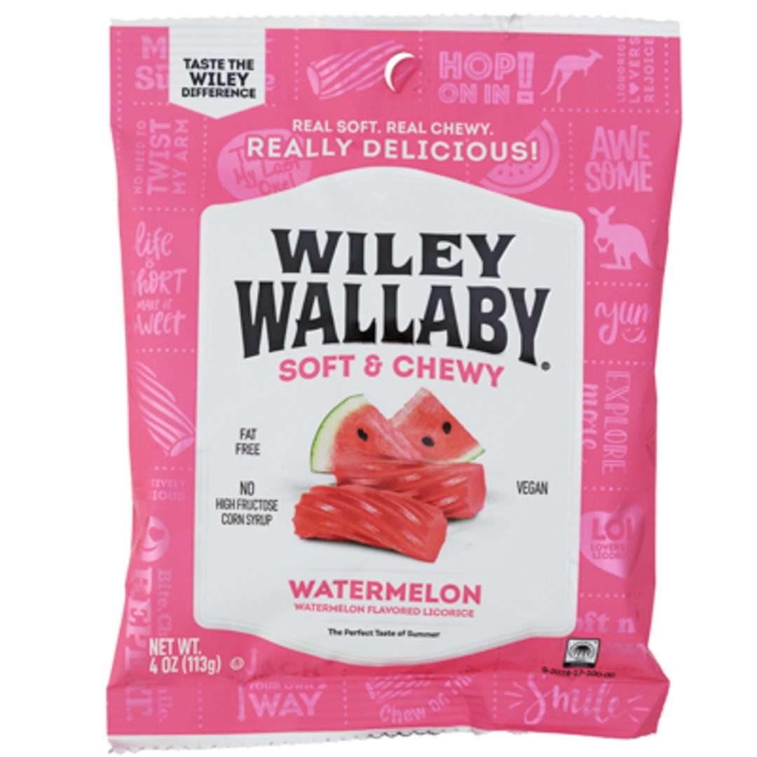 Experience the rich, intense flavor of Wiley Wallaby Watermelon Licorice. Each chewy piece is a pure licorice indulgence that's perfect for candy lovers.