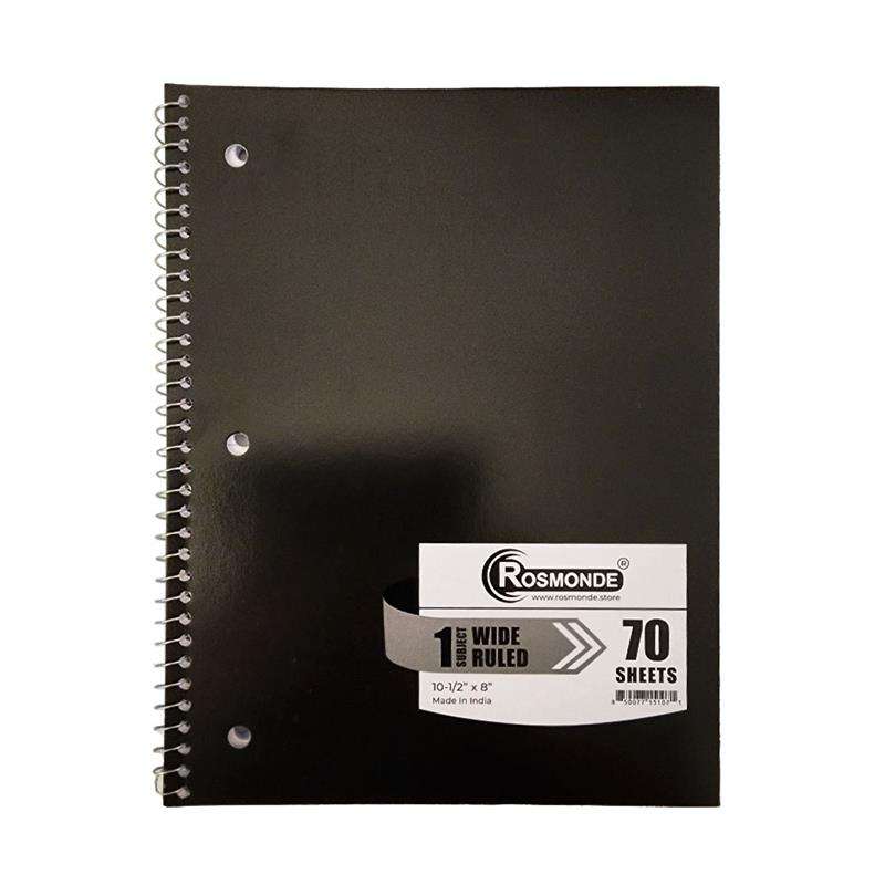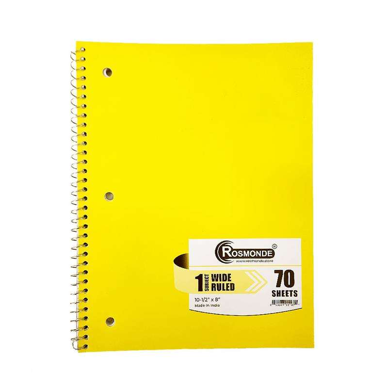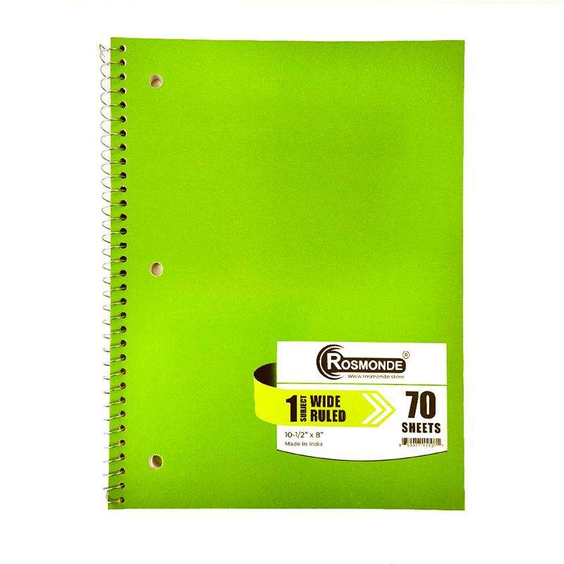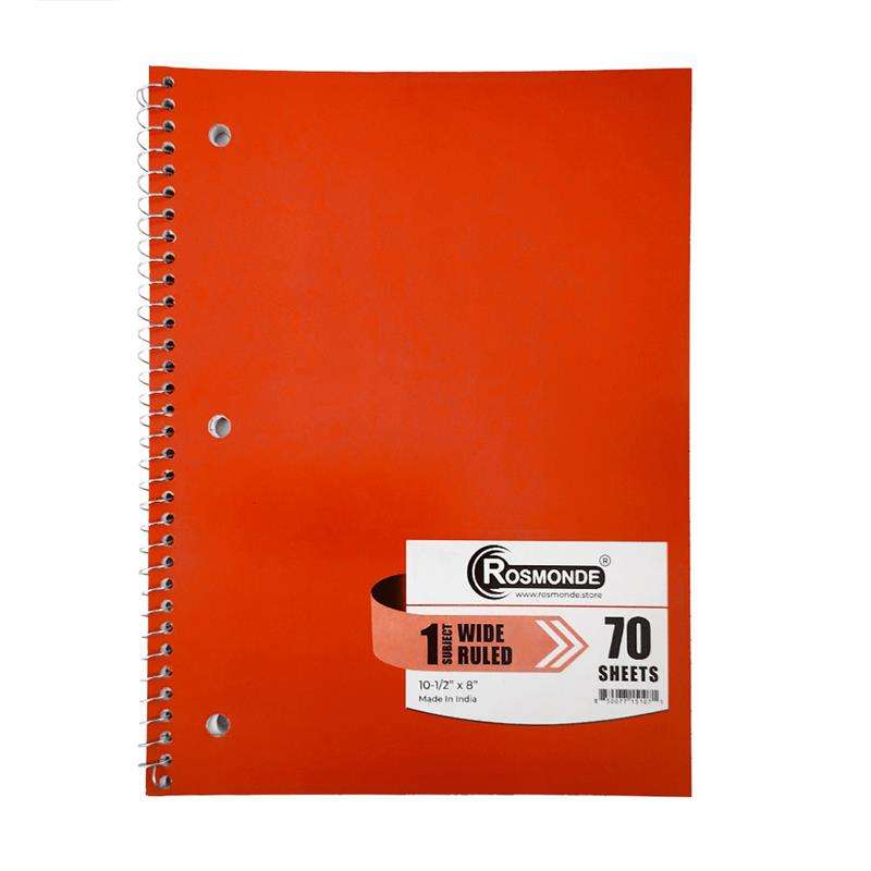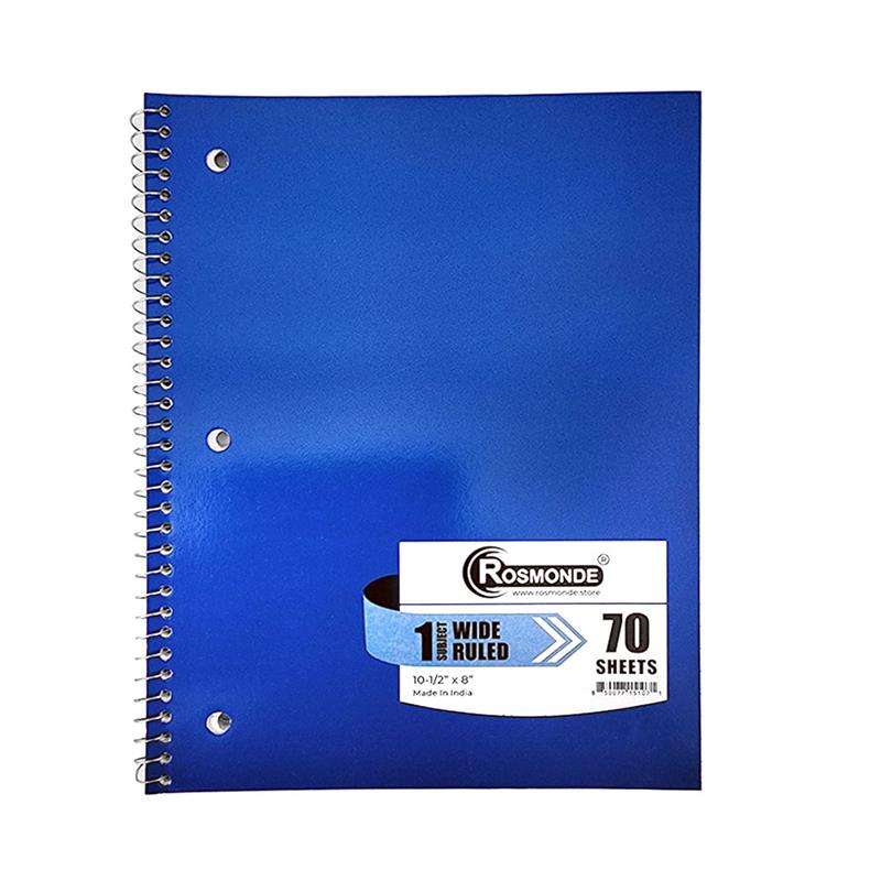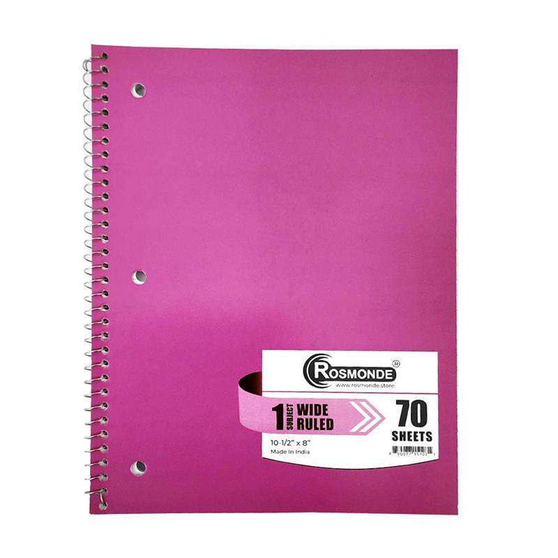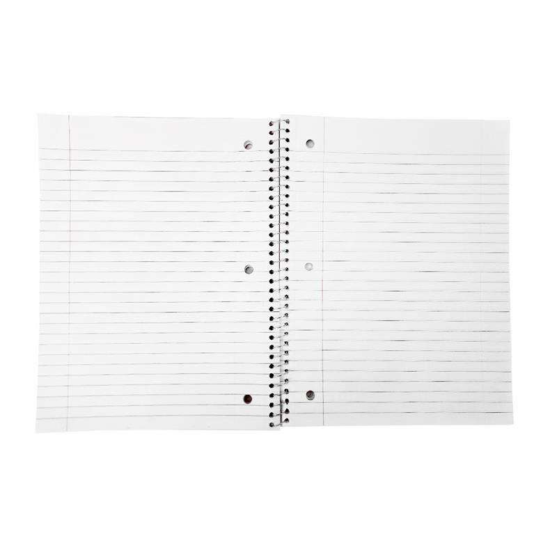 This 1 subject wide-ruled notebook features durable thicker covers, a silver spiral binding, and smooth 56 GSM paper. Measuring 10.5" x 8", it includes 70 sheets and comes in assorted colors--perfect for school or everyday writing.