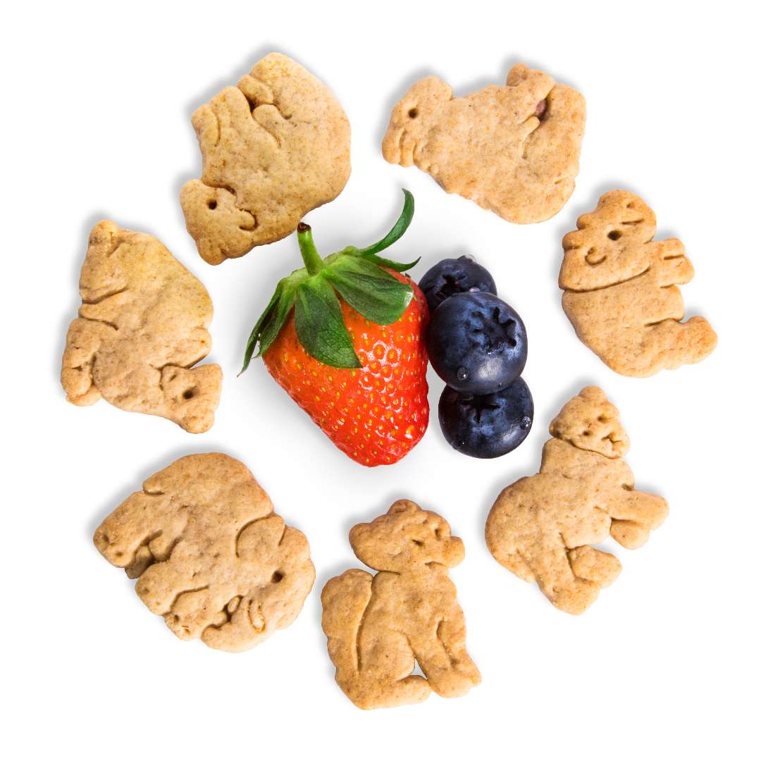 Appleways Bulk Mixed Berry Animal Crackers, 5 lbs. Light crunch, whole grain, nut-free, and preservative-free with only 6g sugar. Perfect for bulk service, meets USDA 1 oz grain equivalent servings.