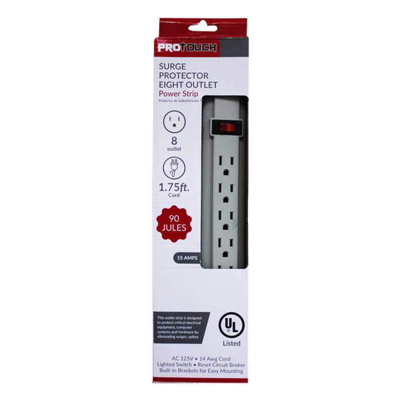 There are eight grounded AC outlets on the surge protector and provides provide power from a distance with the 1.75' cord. They are perfect for creating a centralized hub for your electronics at your home, office, workshop, or garage. They include surge protection with a rating of 90 Jules and an integrated circuit breaker with reset switch. These extension cords protect from voltage spikes and circuit overloads. Buy in bulk and save!