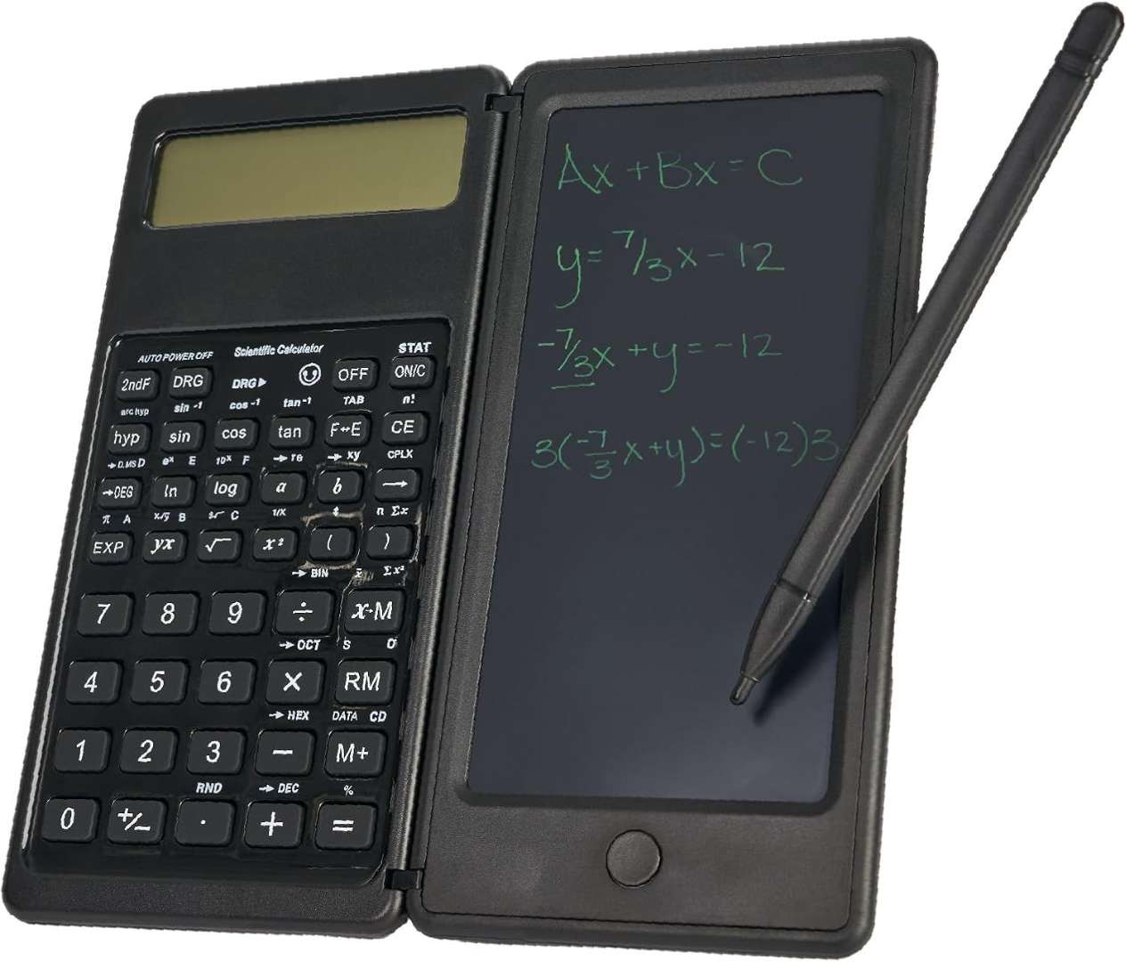 Dual-function scientific calculator with an LCD display and an integrated writing pad for quick notes and equations. Includes stylus for easy writing and erasing.