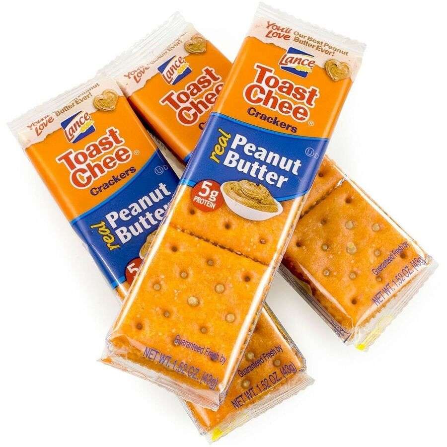 Lance Toast Chee Peanut Butter Crackers offer flaky, crunchy goodness with real peanut butter. Each 6-cracker pack has 5g protein, is kosher, and comes in a 40-count box for easy on-the-go snacking.