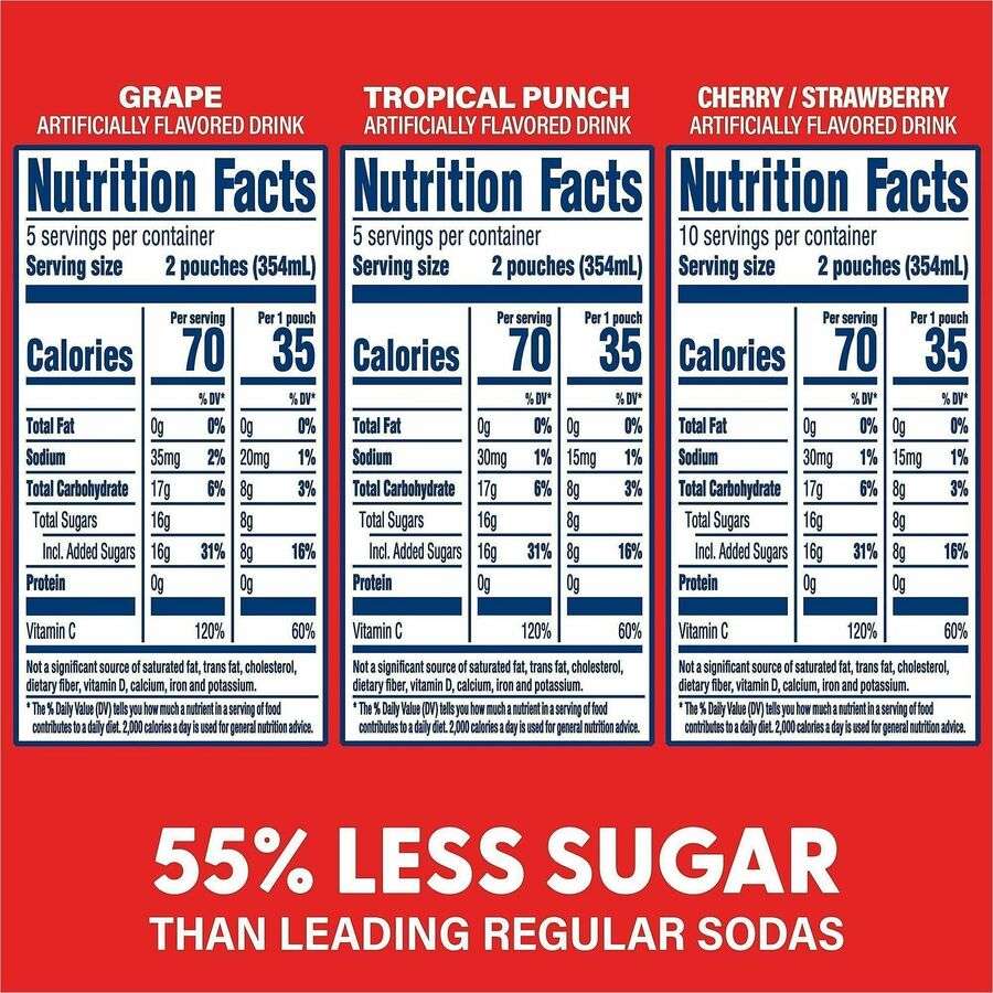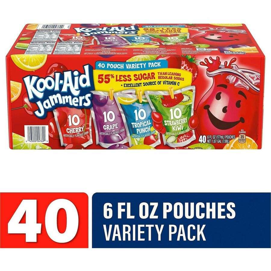 Fuel hydration with Kool Aid Jammers Variety Pack featuring real fruit juice and 100% Vitamin C. Bold fruity flavors and grab-and-go pouches make refreshment easy anywhere.