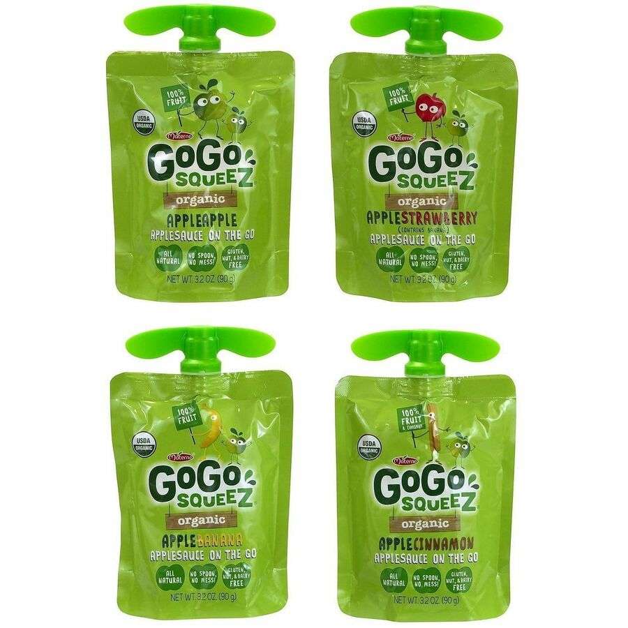 GoGo Squeez Organic Applesauce Pouches deliver 100% fruit flavor in Apple, Strawberry, Banana and Cinnamon. Reclosable caps offer clean, on-the-go snacking made with organic, gluten-free, non-GMO ingredients.