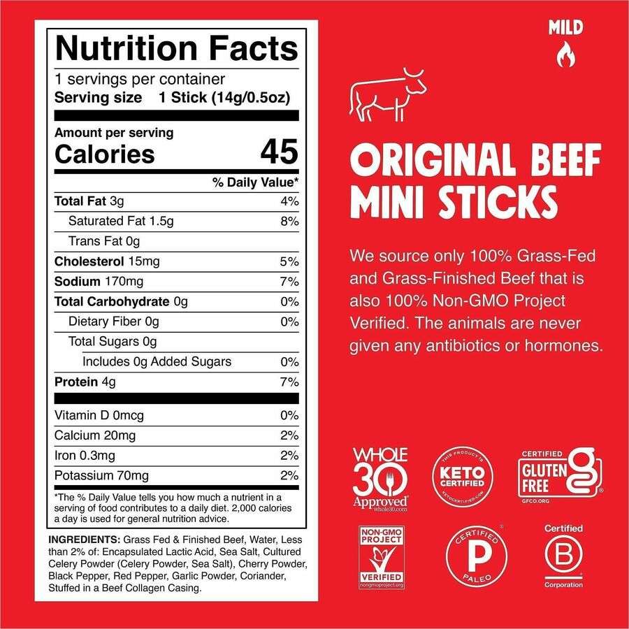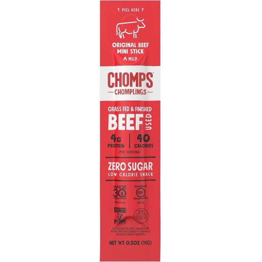 Chomps Original Mini Beef Jerky Sticks feature 100% grass-fed beef and a smoky spice blend. Each stick offers 4g protein, 0g sugar, and clean Keto-friendly nutrition. Sold in 24-pack bundles.