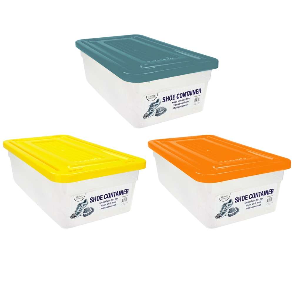 Durable plastic shoe container with assorted color lids in orange, yellow, and teal. Perfect for organizing shoes and ideal for multi-purpose storage throughout the home.