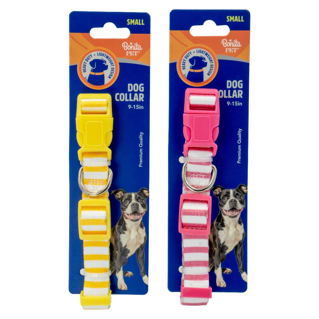 Striped Dog Collars add a cute touch to your pup's everyday style. Adjustable 9-15in fit, made from durable polyester in bright pink and yellow colors.