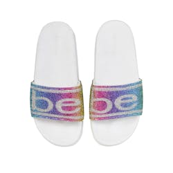 What a way to make a splash by the pool when she arrives in her white slide sandals emblazoned with "bebe" on a rainbow-colored background! These PCU slides are perfect for the beach or hanging out around the backyard!