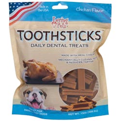 Chicken Flavored Dental Treat Sticks come in a 13-ounce bag, perfectly sized for small breeds. Each stick features a unique pinwheel shape that helps scrub away plaque and tartar while massaging gums. Turn chew time into cleaning time with these tasty treats!