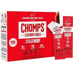 Chomps Original Mini Beef Jerky Sticks feature 100% grass-fed beef and a smoky spice blend. Each stick offers 4g protein, 0g sugar, and clean Keto-friendly nutrition. Sold in 24-pack bundles.
