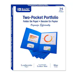 These 2 pocket folders come in a box of 25, making them an ideal choice for donations to schools and building back to school kits for students. Each folder features two interior pockets and two die-cut slots to hold a business card or label, ensuring that important files and documents are kept safe and organized.